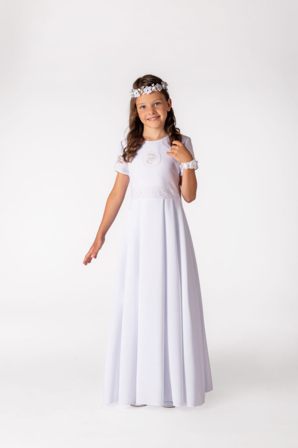 Strój pierwszokomunijny wykonany jest z białej, ładnie układającej się tkaniny.