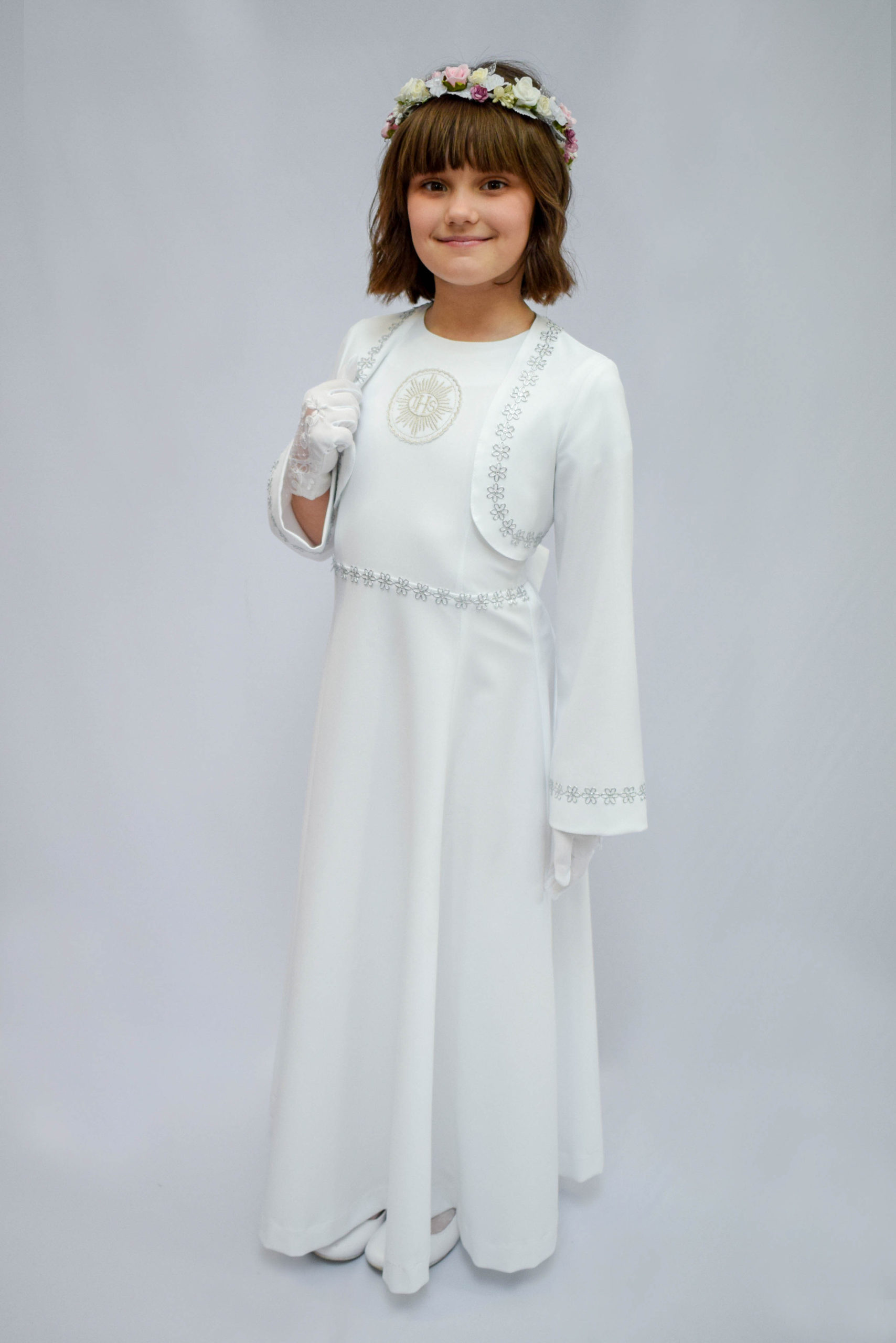Sukienka pierwszokomunijna wykonana jest z białej, ładnie układającej się tkaniny.