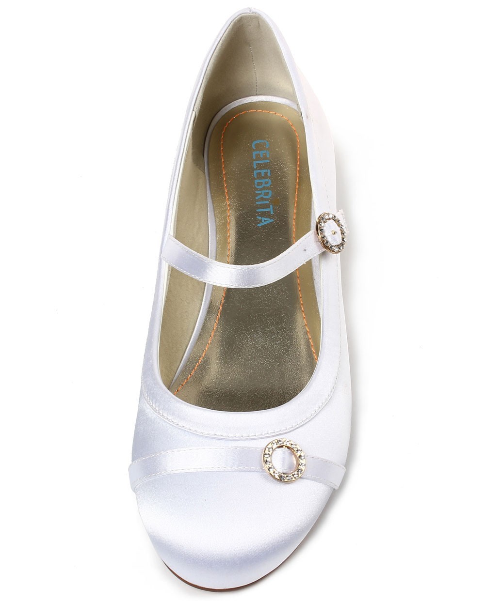 Buty wykonane z satyny z ozdobnymi klamerkami.