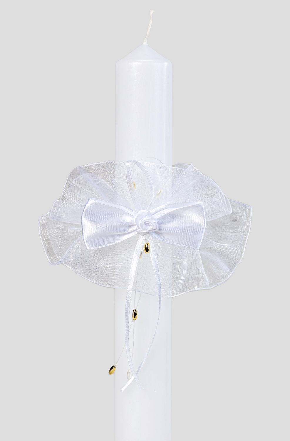 Tiulowa ozdoba do świecy z atłasową kokardką oraz delikatnymi koralikami.